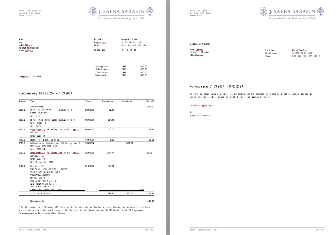 Switzerland Bank J. Safra Sarasin Bank Statement 2 pages