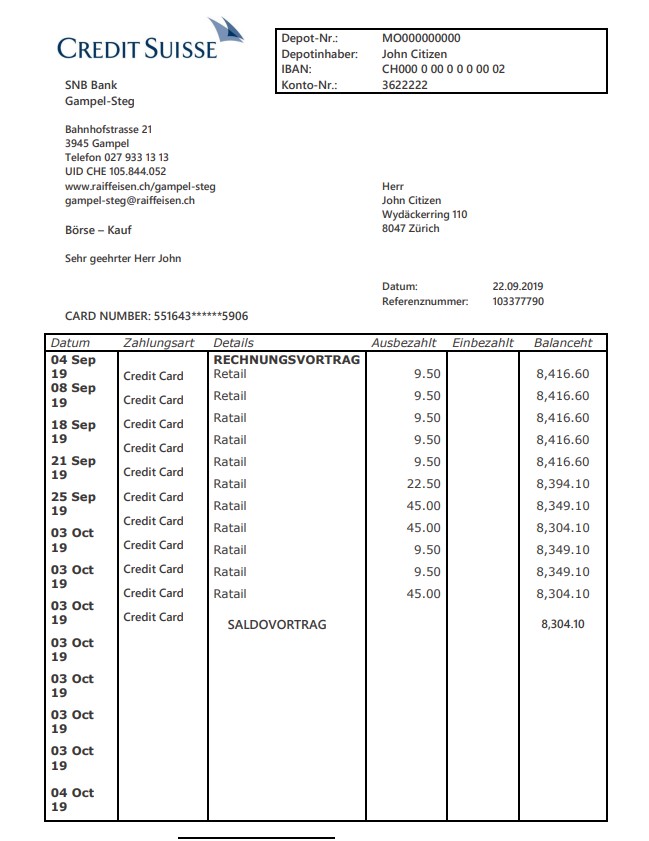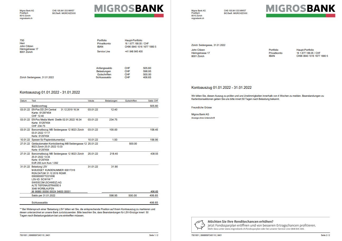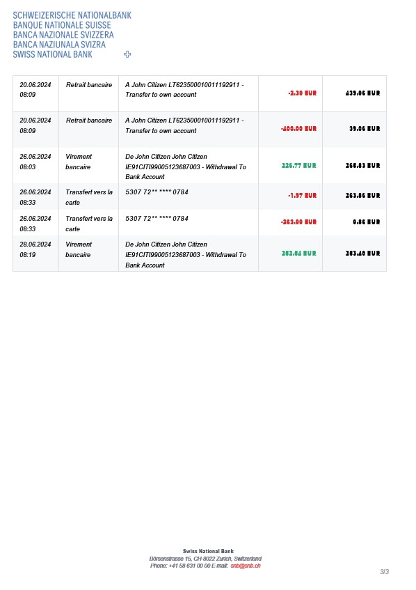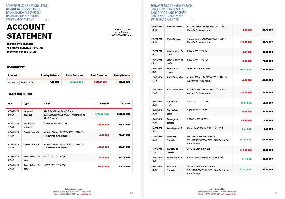 Switzerland Swiss National Bank SNB account statement, 3 pages 2