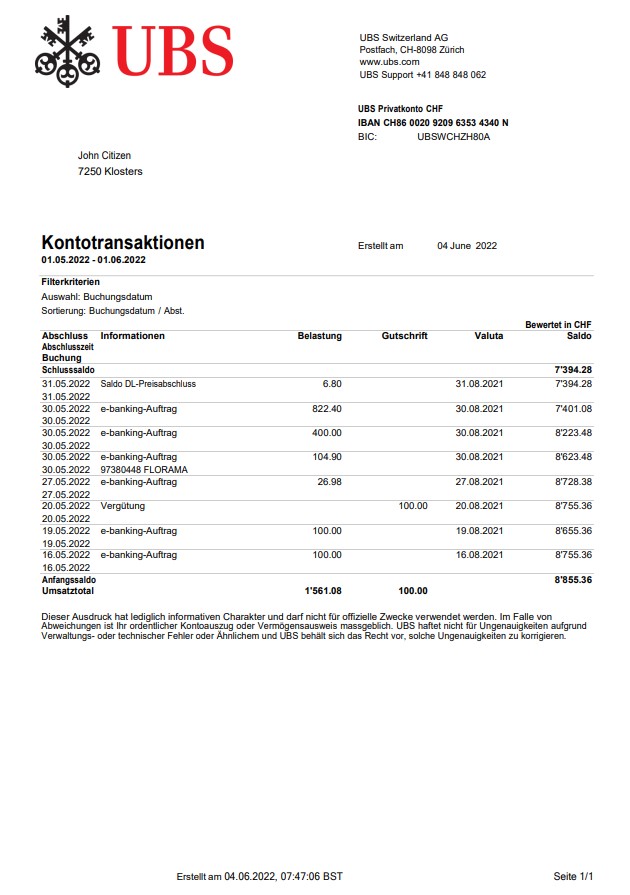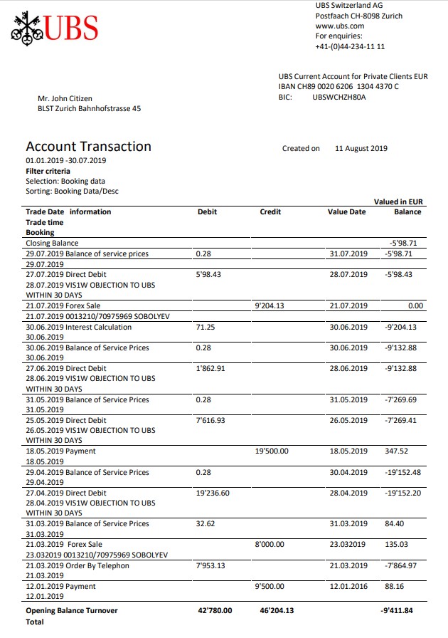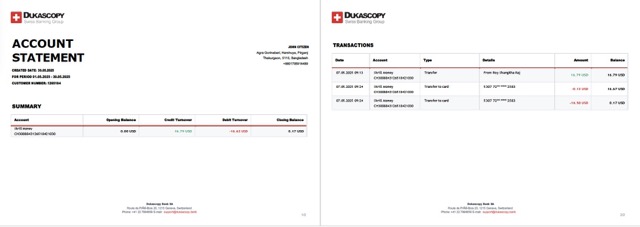Switzerland Dukascopy Bank account statement Word and PDF template, 2 pages
