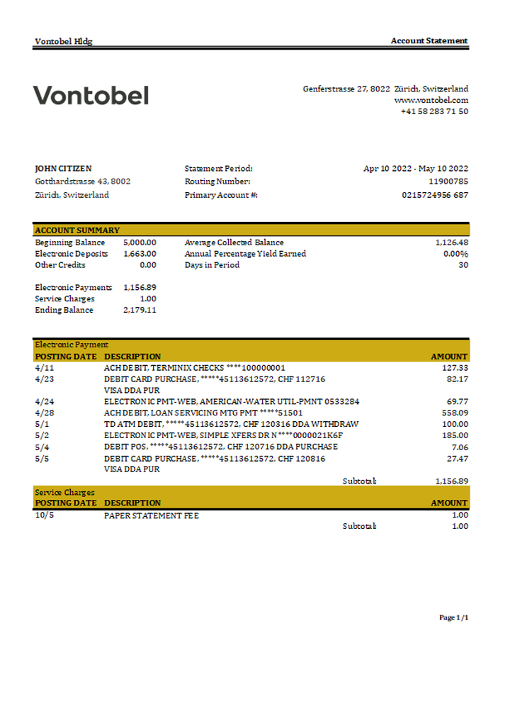 Switzerland Vontobel Bank Statement, Excel and PDF template